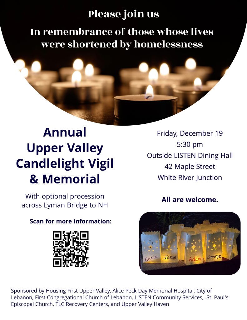 Our 2025 Upper Valley Candlelight Vigil and Memorial will be held on Friday, Dec. 19 at 5:30pm, outside the Listen Dining Hall at 42 Maple Street, WRJ. There will be an optional procession across Lyman Bridge to the NH side of the river, to demonstrate our commitment in both states.